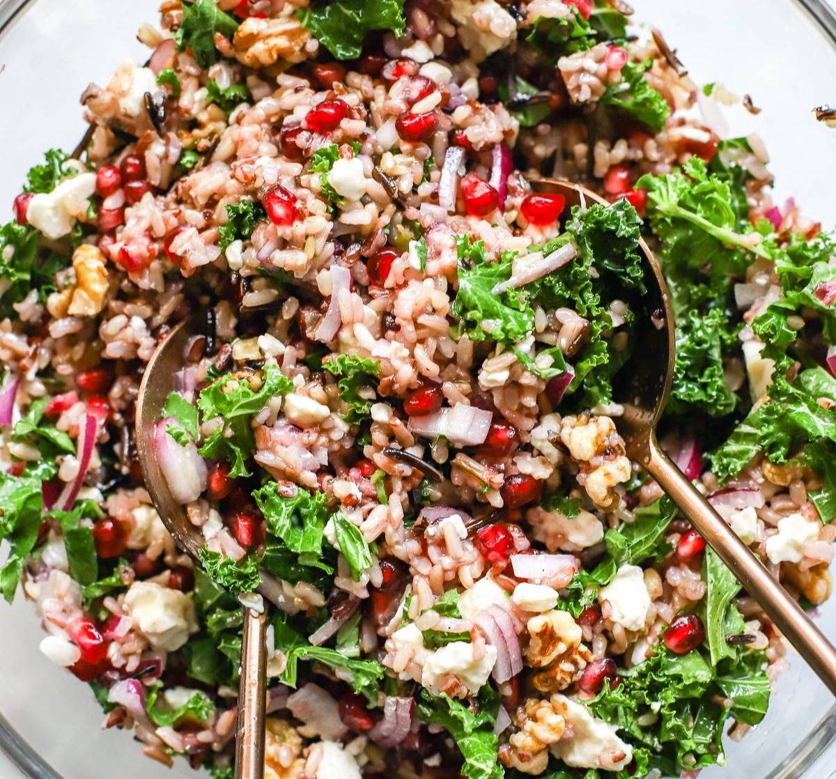 3. Wild Rice Salad with PomegranateThis hearty, seasonal salad has the most amazing flavor combo and adds so much color to the table! Pops of pomegranate, salty feta, walnuts, basil (trust), kale, red onion, and an orange vinaigrette to tie it all together. This is a great one to make ahead!